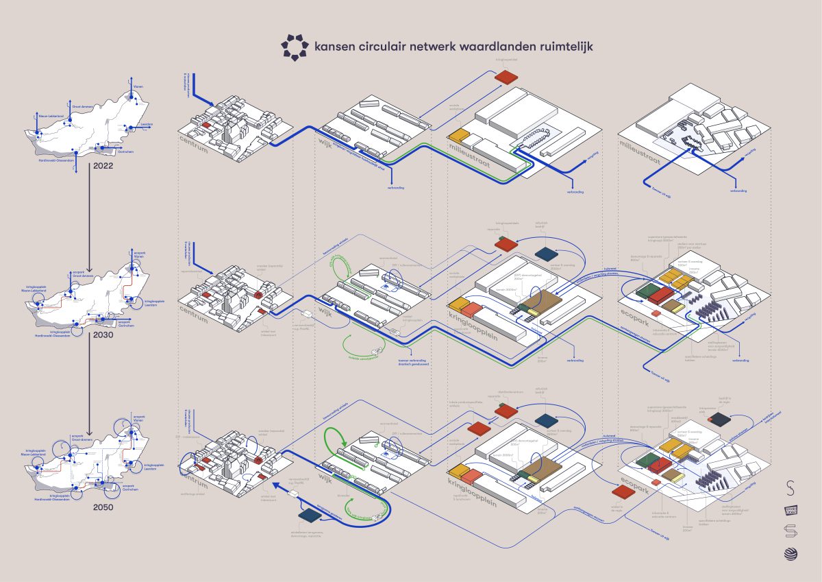 This study examined reference projects and conducted interviews with partners from the circular network. It then looked at data on waste streams and the current spatial layout. A vision for a circular network in 2050 was outlined and tested using propositions. The study is described in a report that includes opportunity maps, a stakeholder map, a timeline and a spatial map.